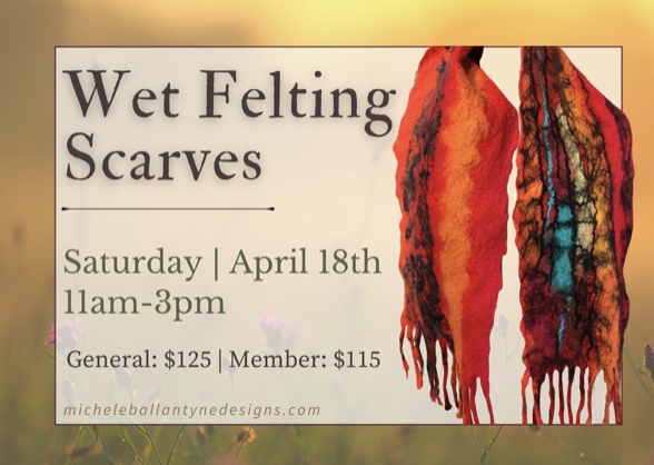 As requested, Michele Ballantyne is returning to The Oregon Garden to guide you through a wet felting scarf making workshop! You will get to create one multi-colored scarf up to 10 in. wide x 6 ft long that will keep you warm and stylish this Spring!