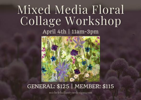 Immerse yourself in the blooming season of Spring! Join artist Michele Ballantyne to freely create and explore a variety of textures. You will be creating a multi media textured 16″ x 20″ collage using a mixture of paper, materials, acrylics, and stretched canvas! All materials will be provided. No experience needed!